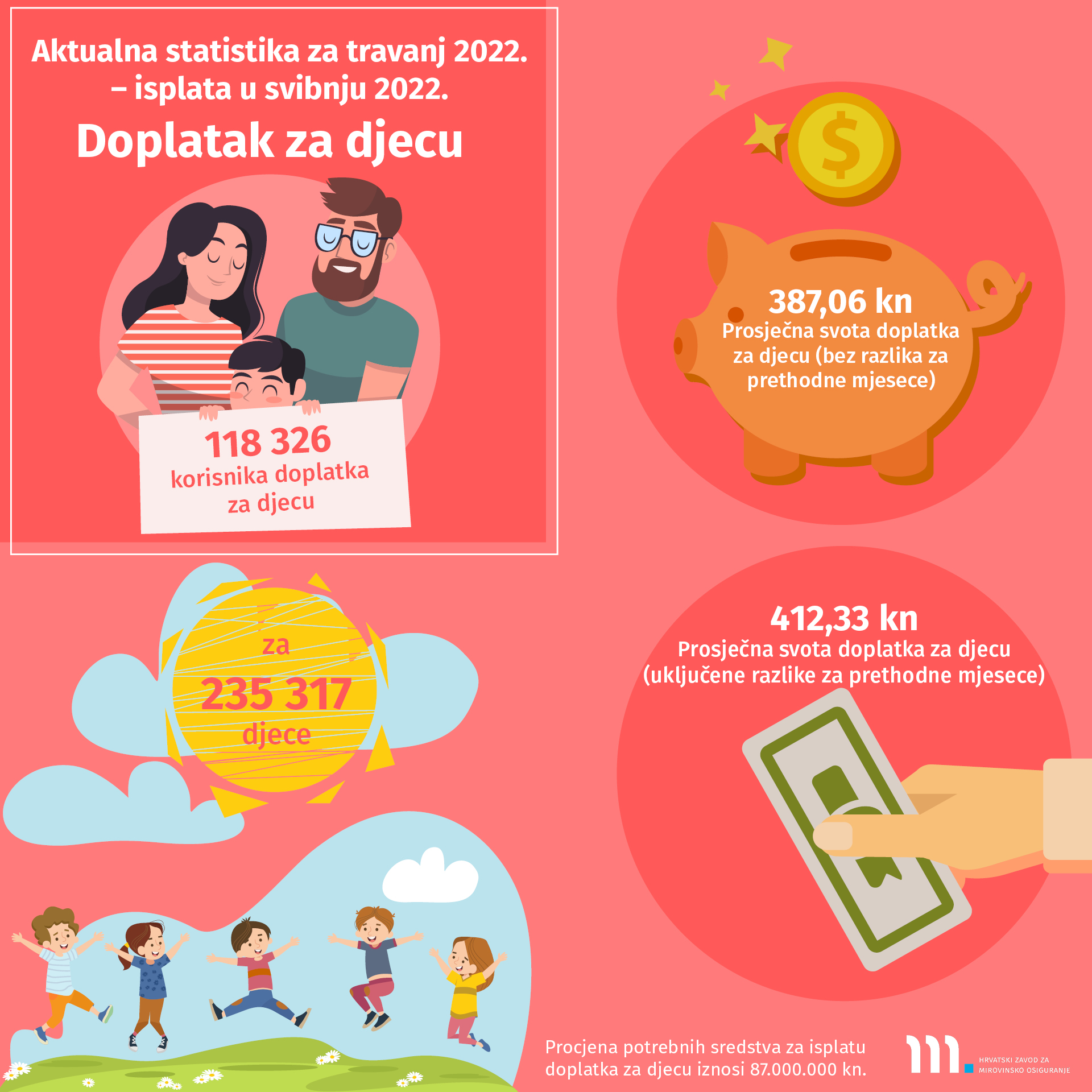 U ovaj su broj uključeni, uz ostale, i podaci o: broju osiguranika prema godinama i kategorijama osiguranja (stanje na dan 31. prosinca, od 2002. do 2021. godine), broju osiguranika prema kategorijama osiguranja i spolu (stanje na dan 30. travnja 2022.), kretanju broja osiguranika prema godinama i mjesecima (od siječnja 2013. do travnja 2022.), korisnicima mirovina prema godinama i kategorijama osiguranja od 2001. do 2021. godine). U dijelu o doplatku za djecu nalaze se podaci o broju korisnika doplatka za djecu i broju djece prema godinama (stanje na dan 31. prosinca, od 2003. do 2021. godine), te o broju korisnika doplatka za djecu i broju djece prema mjesecima za 2021. i 2022., broju korisnika, djece i prosječnim svotama doplatka za djecu za razdoblje od 2017. do 2021. i usporednim prikazom I.-IV.2021./I.-IV.2022., te o kretanjima prema mjesecima (od siječnja 2015. do svibnja 2022.), broju korisnika doplatka za djecu, broju djece i prosječnim mjesečnim svotama doplatka za djecu prema područnim službama/uredima i županijama za travanj 2022. (isplata u svibnju 2022.), broju korisnika nacionalne naknade za starije osobe prema spolu i dobi, prosječnoj dobi županijama/područnim službama/područnim uredima (stanje na dan 30. travnja 2022.).