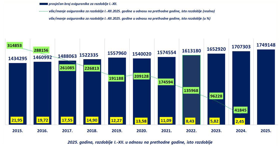- u odnosu na 31. prosinca 2024. - povećanje od 1,22 %, odnosno 20 915 osiguranika više