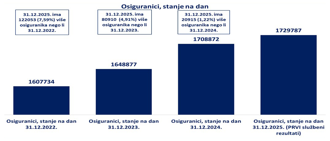 Prema prvim podatcima, Hrvatski zavod za mirovinsko osiguranje na dan 31. prosinca 2025. bilježi 1 729 787 osiguranika.