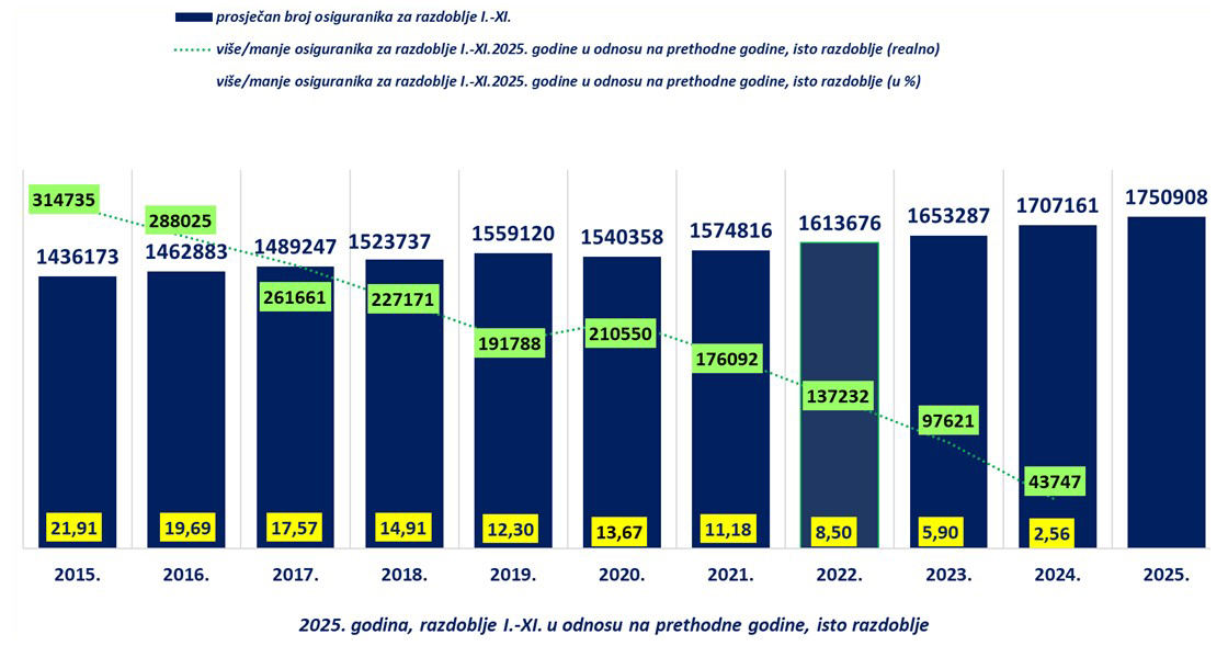 Broj osiguranika u studenome 2025. u odnosu na isti mjesec prethodnih godina pokazuje značajan rast: