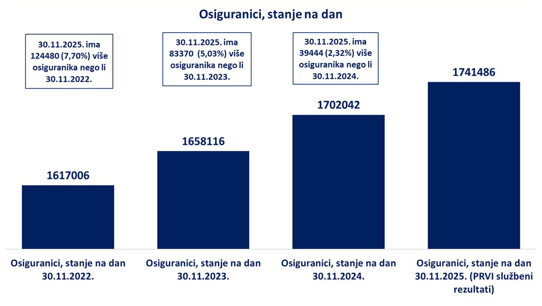 Prema prvim podatcima, Hrvatski zavod za mirovinsko osiguranje na dan 30. studenoga 2025. bilježi 1 741 486 osiguranika.